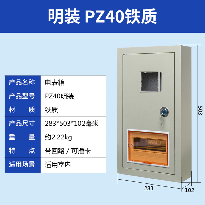 我公司生產的PZ40電表箱采用0.5-1mm厚冷軋鋼板和進口PC高透視窗,并帶有門鎖,安全防盜,大氣美觀。可安裝各類電能表和C45、空氣開關、斷路器閘刀等,廣泛用于家庭、公寓、學校、工廠等場所。